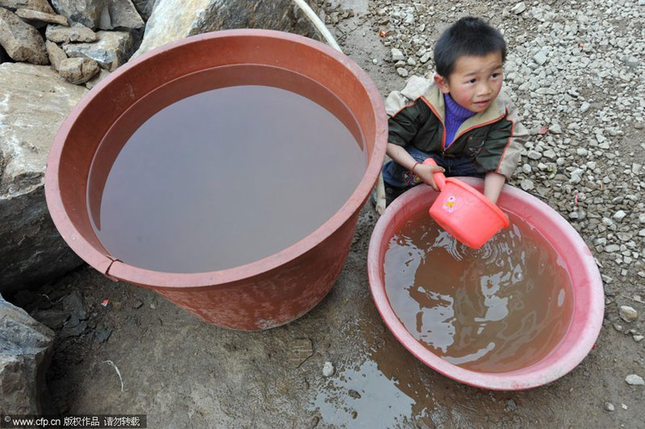 3月16日,貴州省開(kāi)陽(yáng)縣城關(guān)鎮(zhèn)青西村村民付燕子帶著孩子在水庫(kù)底找水。連日來(lái),貴州省旱情加劇,貴陽(yáng)市郊開(kāi)陽(yáng)縣城關(guān)鎮(zhèn)居民飲水源青西村水庫(kù)幾乎干涸。貴州省開(kāi)陽(yáng)縣城關(guān)鎮(zhèn)青西村一兒童在接水。吳東俊/CFP