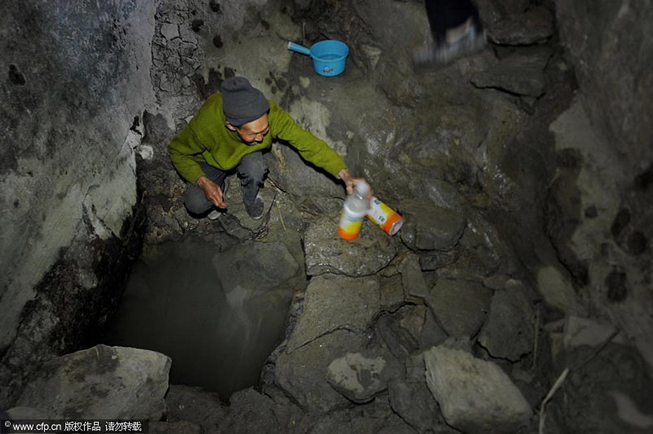 3月18日,貴州省息烽縣流長(zhǎng)鄉(xiāng)新中村村民在從沒有干得如此嚴(yán)重的深井里取水。 吳東俊/CFP