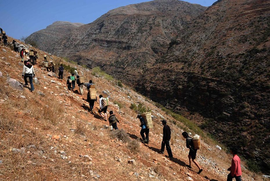 村民背著水走在陡峭的山崖上(3月7日攝)。村民需要背著幾十公斤重的水桶,從海拔1000多米的江邊,小心翼翼地往海拔1800多米的村中跋涉。圖片來源:新華網(wǎng) 秦晴 攝