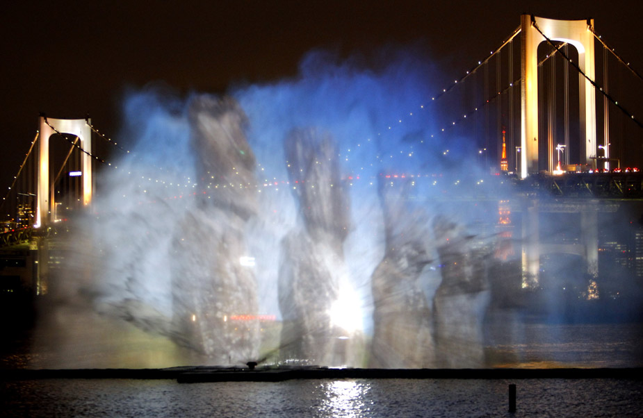 3月19日晚,在日本東京灣上演了一場(chǎng)美輪美奐的“海上幻燈”。東京灣的噴泉噴射出長60米、高23米的各種海洋生物的畫面,令人驚嘆。
