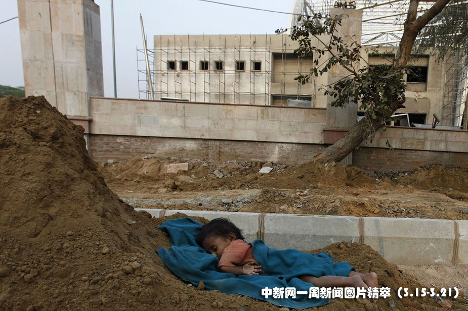 18日(周四),印度新德里,一個(gè)孩子在英聯(lián)邦運(yùn)動(dòng)會(huì)體育場(chǎng)外的工地上睡覺。