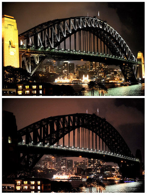 由世界自然基金會發(fā)起的“地球一小時”環(huán)保活動27日20點30分按照時區(qū)依次在全球數(shù)千個城市展開。圖為澳大利亞悉尼港大橋在熄燈前和熄燈后的景色。