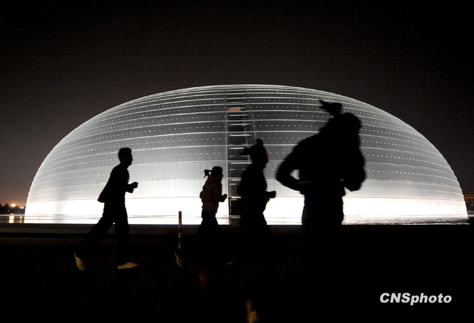 3月27日20點(diǎn)16分,熄燈前許多青年在燈火通明的國家大劇院周圍鍛煉。中新社發(fā) 廖攀 攝