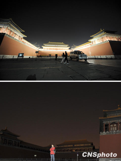 3月27日20時30分,北京故宮博物院與巴黎埃菲爾鐵塔、紐約帝國大廈、悉尼歌劇院等國際地標一起履行“地球一小時”的熄燈承諾關閉了景觀燈。圖為當晚關燈前后的故宮午門廣場。中新社發(fā) 廖攀 攝