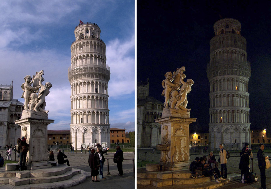 由世界自然基金會(huì)發(fā)起的“地球一小時(shí)”環(huán)保活動(dòng)27日20點(diǎn)30分按照時(shí)區(qū)依次在全球數(shù)千個(gè)城市展開(kāi)。圖為意大利比薩斜塔在熄燈前和熄燈后的景色。