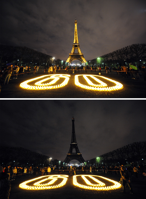 由世界自然基金會(huì)發(fā)起的“地球一小時(shí)”環(huán);顒(dòng)27日20點(diǎn)30分按照時(shí)區(qū)依次在全球數(shù)千個(gè)城市展開。圖為法國(guó)巴黎埃菲爾鐵塔熄燈后和亮燈后的照片。