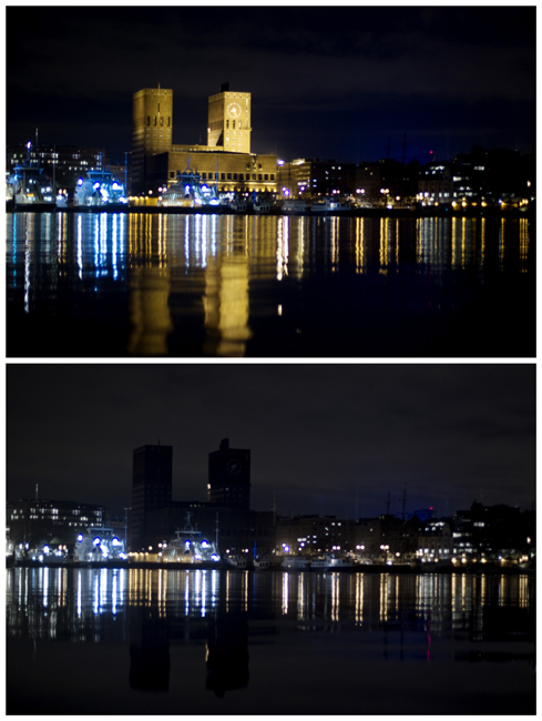 由世界自然基金會(huì)發(fā)起的“地球一小時(shí)”環(huán);顒(dòng)27日20點(diǎn)30分按照時(shí)區(qū)依次在全球數(shù)千個(gè)城市展開。圖為挪威奧斯陸市政廳在熄燈前和熄燈后的景色。
