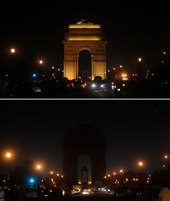 由世界自然基金會(huì)發(fā)起的“地球一小時(shí)”環(huán)保活動(dòng)27日20點(diǎn)30分按照時(shí)區(qū)依次在全球數(shù)千個(gè)城市展開(kāi)。圖為印度門(mén)在熄燈前和熄燈后的景色。