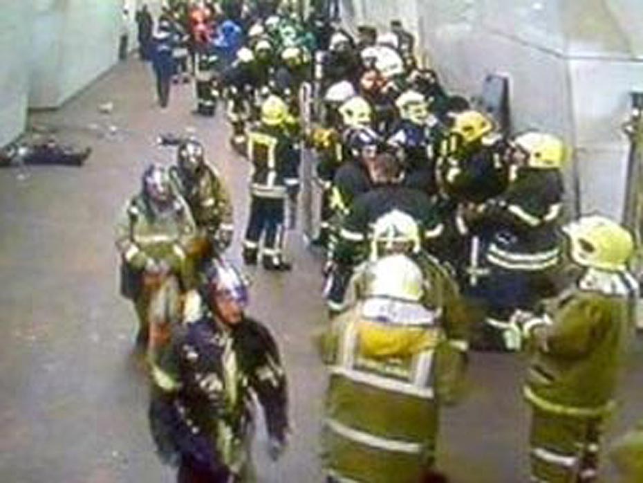 圖為發(fā)生爆炸事件的地鐵監(jiān)視器所拍攝的救援人員正在準(zhǔn)備進(jìn)入爆炸現(xiàn)場(chǎng)。