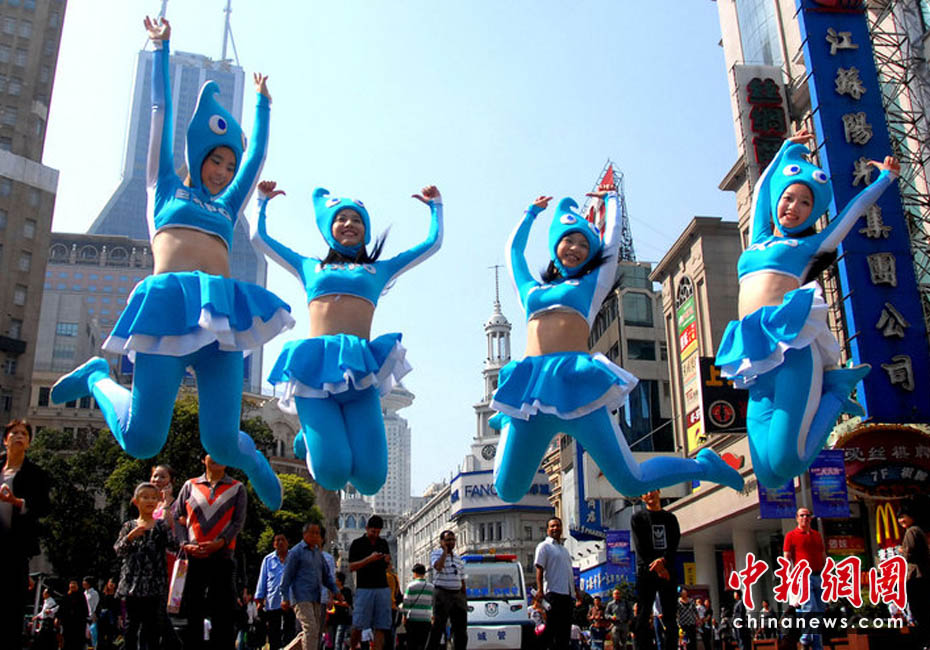 上海南京路步行街,幾名“海寶”打扮的少女出現(xiàn)在街頭,引起不少路人和游客的觀看。這是上海商貿(mào)旅游學(xué)校的女學(xué)生扮演的“歡樂(lè)海寶”,她們參加演出后,在街頭通過(guò)生動(dòng)的形體語(yǔ)言來(lái)展示世博會(huì)的可愛(ài)吉祥物--“海寶”。 楊毅CFP