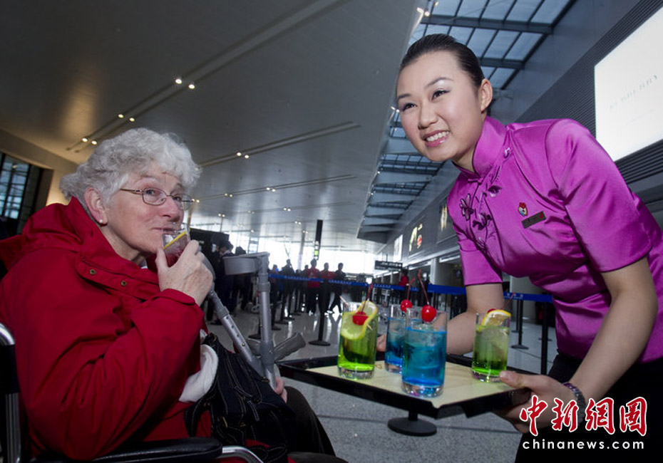 3月25日,上海虹橋機場T2航站樓。上航世博金牌示范乘務(wù)員徐翼邀請一名坐在輪椅上的外國旅客品嘗“世博特飲”。劉行喆/CFP