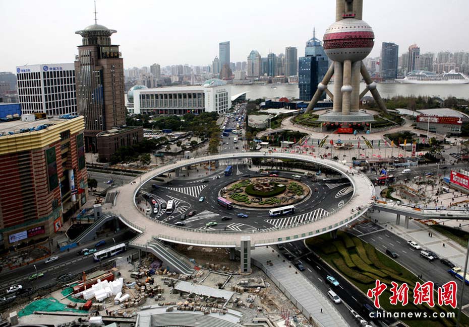 位于上海浦東陸家嘴中心地區(qū)的環(huán)形天橋——“明珠環(huán)”人行天橋基本建成,預(yù)計(jì)在世博會(huì)前正式投入啟用!懊髦榄h(huán)”毗鄰東方明珠廣播電視塔,圓周長(zhǎng)370米,設(shè)4個(gè)出口,并配有步行樓梯、自動(dòng)扶梯和殘疾人無(wú)障礙垂直電梯。它的建成已成為陸家嘴金融中心地區(qū)一大景觀。徐網(wǎng)林CFP