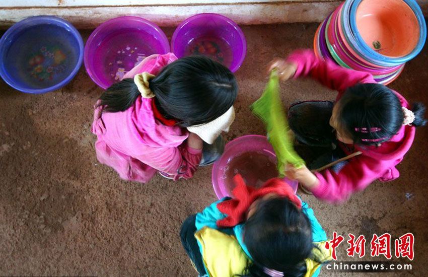 劉蕙玫和兩個(gè)同學(xué)一起共用一個(gè)盆水洗臉,而這“盆”水只是兩杯水。沙浪 攝