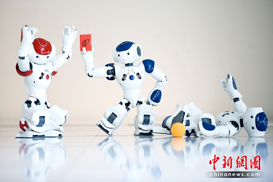 機(jī)器人足球隊(duì)在英國愛丁堡國際科學(xué)節(jié)亮相,它們由愛丁堡大學(xué)研制而成。機(jī)器人足球隊(duì)員內(nèi)置處理器可以感受周圍的環(huán)境和其他機(jī)器人的反應(yīng)。圖片來源:中國新聞網(wǎng)