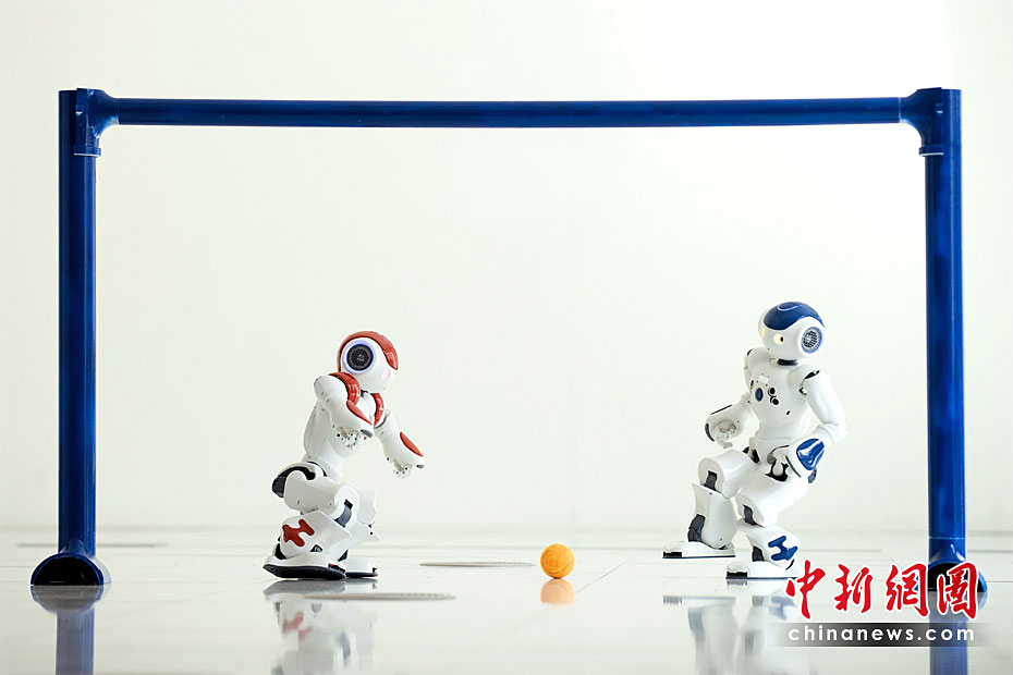 機器人足球隊在英國愛丁堡國際科學節(jié)亮相,它們由愛丁堡大學研制而成。機器人足球隊員內(nèi)置處理器可以感受周圍的環(huán)境和其他機器人的反應。圖片來源:中國新聞網(wǎng)