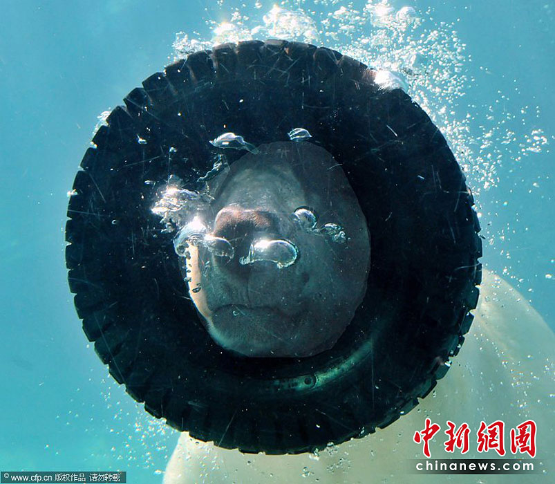 美國(guó)Asheboro北卡羅來納動(dòng)物園一頭名叫威利的北極熊可是個(gè)“活寶”。任何一個(gè)可用的東西都能成為它在鏡頭前“耍寶”的玩具。圖片來源:CFP
