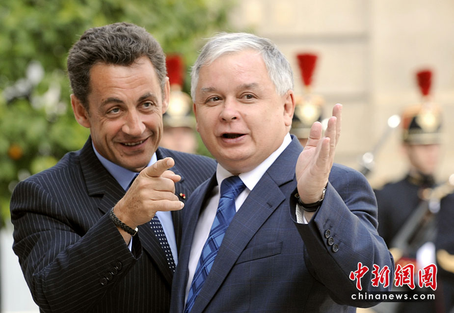 波蘭總統(tǒng)卡欽斯基乘坐的一架圖-154飛機(jī)10日在俄羅斯斯摩棱斯克州北部一軍用機(jī)場降落時失事,至少87人死亡。卡欽斯基本人被確認(rèn)身亡。圖為2007年波蘭總統(tǒng)卡欽斯基與法國總統(tǒng)薩科奇。