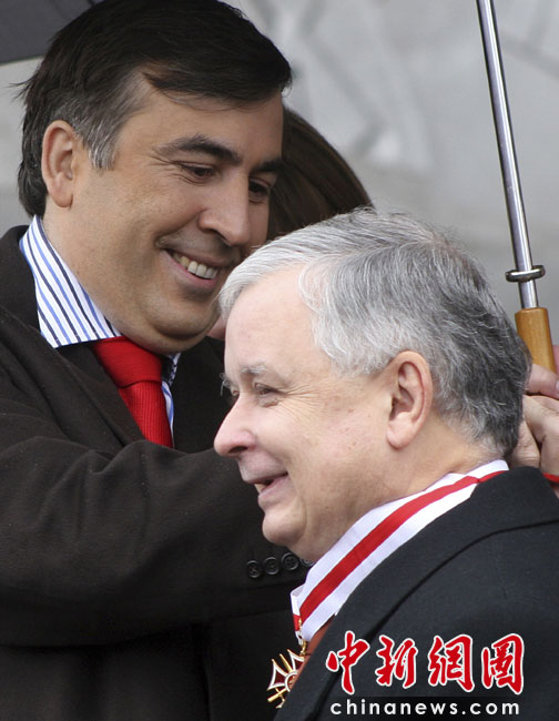 波蘭總統(tǒng)卡欽斯基乘坐的一架圖-154飛機(jī)10日在俄羅斯斯摩棱斯克州北部一軍用機(jī)場(chǎng)降落時(shí)失事,至少87人死亡?J斯基本人被確認(rèn)身亡。圖為2007年波蘭總統(tǒng)卡欽斯基與格魯吉亞總統(tǒng)米哈伊爾薩卡什維利。