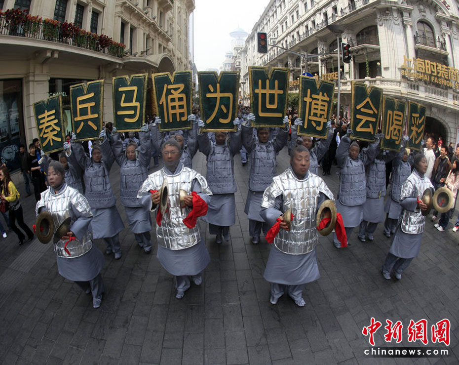 4月10日,由西安旅游局承辦的兵馬俑牽手上海世博會大型旅游宣傳咨詢活動(dòng)舉行。來自兵馬俑故鄉(xiāng)的百人表演隊(duì)伍,身著灰色的兵馬俑服裝,以鏗鏘的節(jié)奏、雄壯的氣勢,在上海南京東路步行街和東方明珠廣場游演,吸引了大批市民及海內(nèi)外游客駐足觀看。文音/CFP