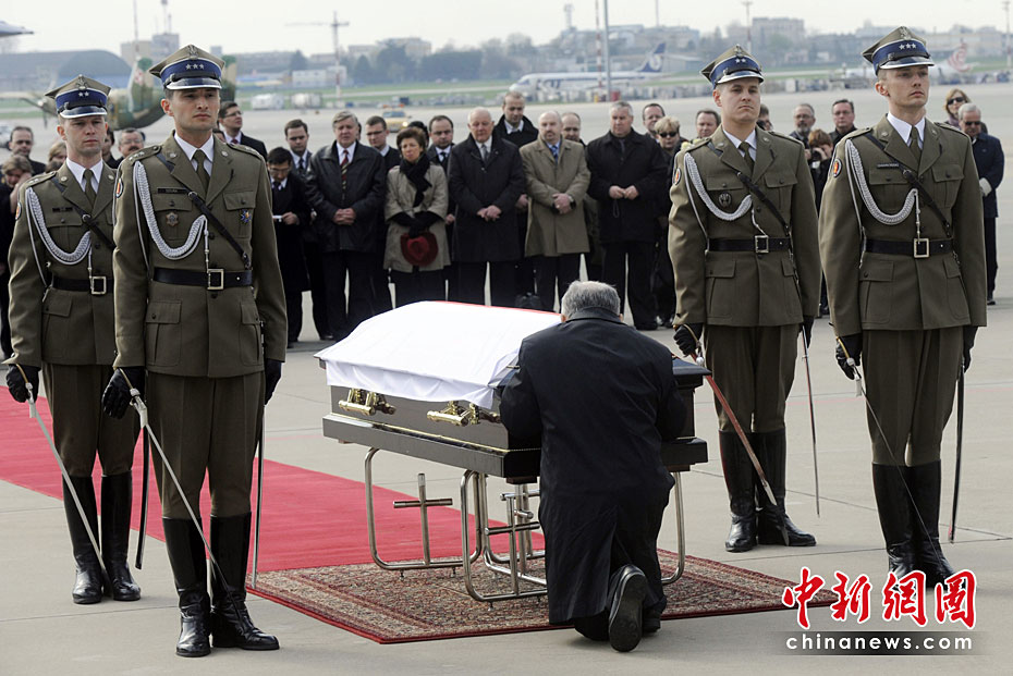 4月10日,卡欽斯基乘坐專機從華沙飛往俄羅斯斯摩棱斯克市,參加卡廷森林事件70周年紀念活動。途中飛機在斯摩棱斯克“北方”軍用機場附近降落時失事,共造成包括卡欽斯基夫婦及眾多政府高官在內(nèi)的96人死亡。慘劇發(fā)生后,舉世震驚。圖為卡欽斯基的孿生兄弟在遺體前跪拜。
