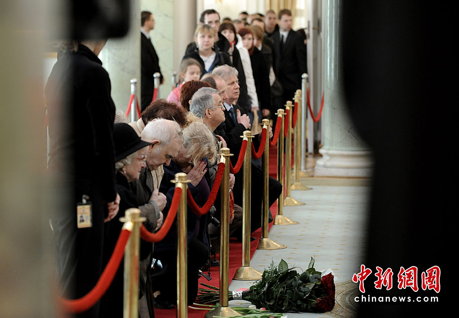 當?shù)貢r間4月13日14時,波蘭總統(tǒng)夫婦的遺體被安放在總統(tǒng)府最大的圓柱廳供民眾瞻仰和悼念。總統(tǒng)卡欽斯基及其夫人的葬禮將于18日舉行。圖片來源:中國新聞網(wǎng)