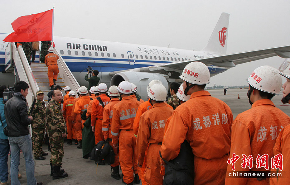 圖為4月14日18時(shí)02分和18時(shí)08分,國航西南分公司執(zhí)行緊急救援包機(jī)的一架空中客車A319和一架波音757飛機(jī)共搭載302名消防救災(zāi)人員和搜救設(shè)備從成都雙流機(jī)場起飛,火速趕往西寧,將前往青海玉樹7.1級(jí)地震震區(qū)救援。中新社發(fā) 易世忠 攝