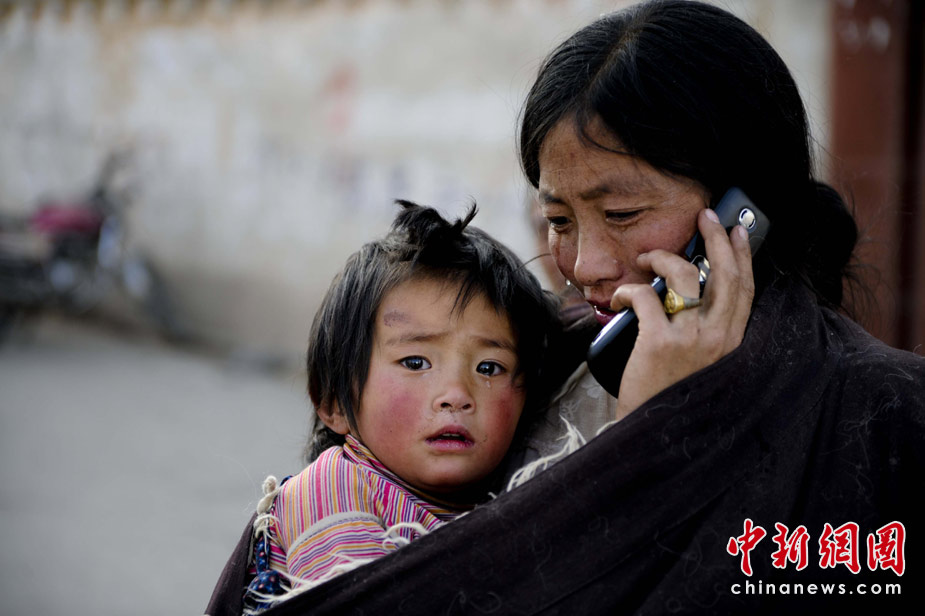 4月15日,青海玉樹縣體育場的地震災(zāi)民安置點內(nèi),一位母親在與親人通話時潸然淚下,懷里小女兒的腳傷還在等待醫(yī)治。中新社發(fā) 廖攀 攝