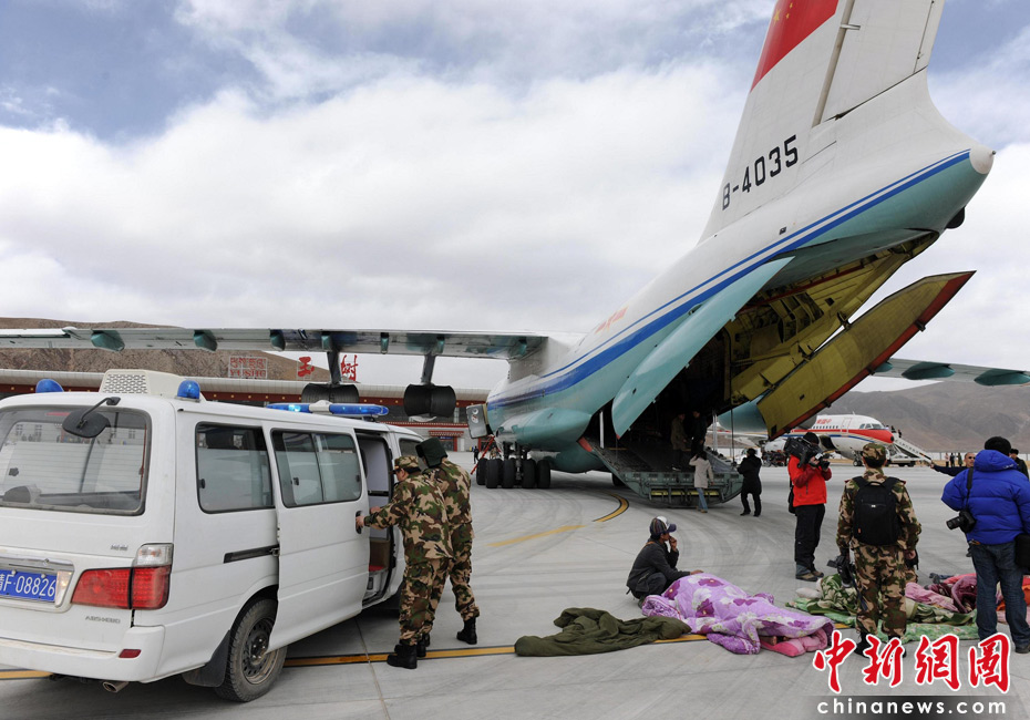15日下午3時(shí)許,空軍動(dòng)用一架伊爾-76運(yùn)輸機(jī)在玉樹(shù)機(jī)場(chǎng)起運(yùn)30多位震災(zāi)傷員,就近飛往成都市進(jìn)行救治。中新社發(fā) 符永康 攝