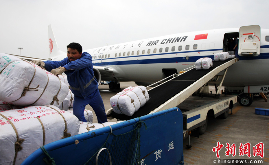 4月15日,重慶江北國際機(jī)場停機(jī)坪上,工人們緊張地將救援物資裝運(yùn)上飛機(jī)準(zhǔn)備起運(yùn)青海地震災(zāi)區(qū)。青海玉樹縣地震發(fā)生后,中共中央政治局委員、重慶市委書記薄熙來庚即作出重要批示,要求重慶全力以赴支援災(zāi)區(qū),根據(jù)災(zāi)區(qū)需求提供支援。中共重慶市委、市政府第一時(shí)間向青海省政府發(fā)去了慰問電,并支援災(zāi)區(qū)300萬元和大批救援物資,首批救援物資于當(dāng)日下去從重慶起飛空運(yùn)至災(zāi)區(qū)。中新社發(fā) 郭晉嘉 攝