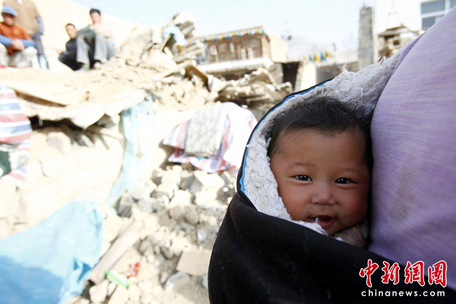 圖為4月15日,玉樹,三個月大的白瑪才措被母親搶救出來。青友 攝