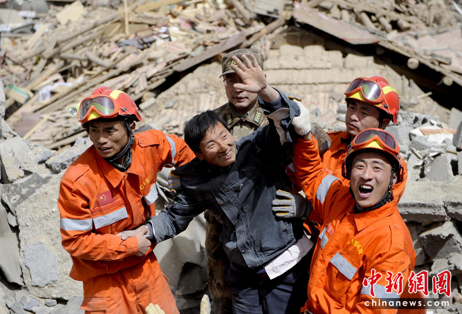 圖為4月15日12時,一位幸存者被中國國際地震救援隊(duì)在青海玉樹縣結(jié)古鎮(zhèn)西北牛賓館廢墟中救出,他微笑著揮動手臂。中新社發(fā) 廖攀 攝