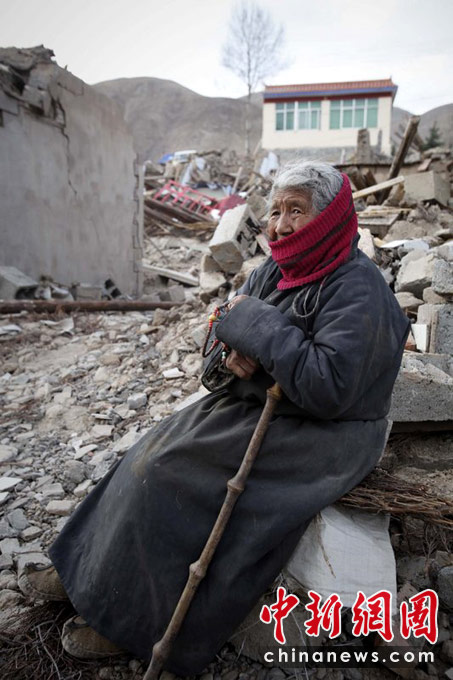 圖為4月15日,青海玉樹,新建路,84歲的老奶奶卓瑪坐在家門口,她說她46歲的女兒已經(jīng)在地震中遇難了。(CFP 圖)
