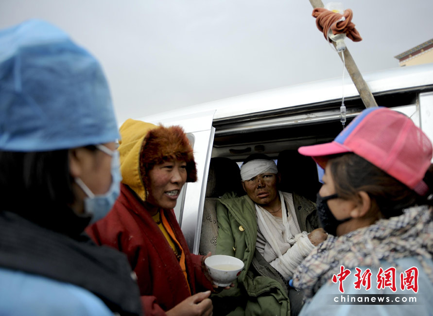 4月16日,一名地震中受傷者在青海玉樹體育場的車?yán)锝邮苤委煛?中新社發(fā) 廖攀 攝