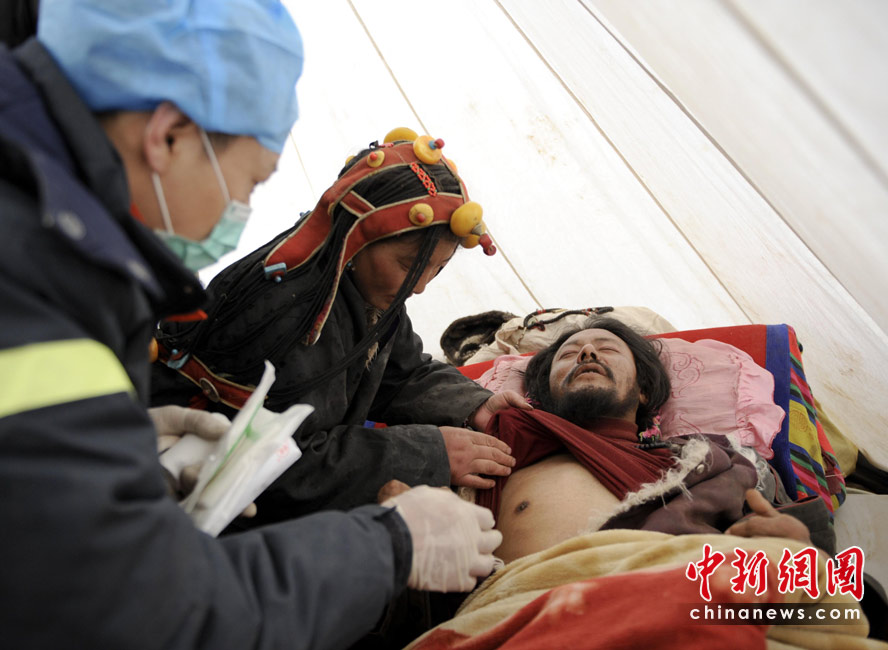 4月16日,青海玉樹體育場地震災(zāi)民安置點(diǎn),武警醫(yī)院醫(yī)療隊(duì)醫(yī)務(wù)人員來到東周丹增家的帳篷里為傷者檢查身體。中新社發(fā) 廖攀 攝