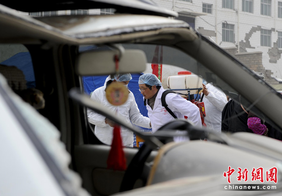 4月16日,青海玉樹體育場地震災(zāi)民安置點,青海疾控中心人員開展消毒防疫工作。 中新社發(fā) 廖攀 攝