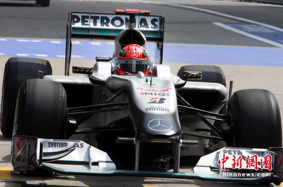 4月16日,2010國(guó)際汽聯(lián)F1世界錦標(biāo)賽上海站在上海國(guó)際賽車場(chǎng)開始車手第一、第二次練習(xí)賽。圖為代表梅賽德斯GP車隊(duì)出戰(zhàn)的老車王、德國(guó)車手舒馬赫重回上海賽道。 中新社記者 任晨鳴 攝