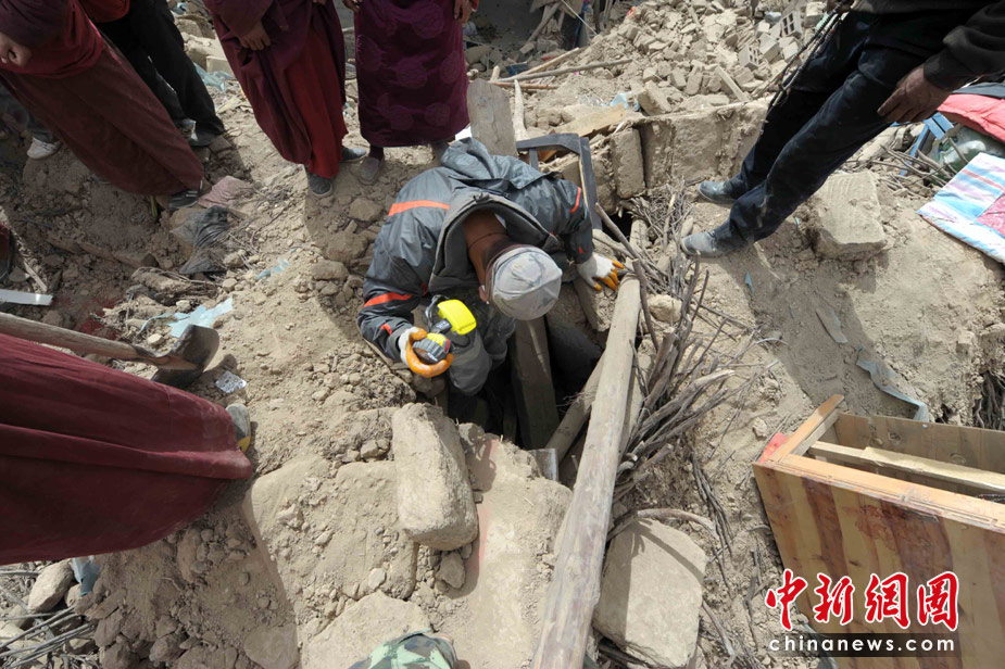 4月16日,青海玉樹地震救援進(jìn)入第三天,來自蘭州軍區(qū)、山東消防特勤、重慶特勤、廣東邊防總隊(duì)、云南邊防總隊(duì)、青海民兵等搜救隊(duì)連續(xù)搜救,幸存者奇跡生還。中新社發(fā) 陳文 攝