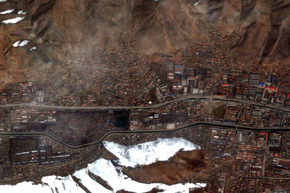 利用對(duì)地觀測(cè)中心2010年4月16日獲取的高分辨率航空遙感數(shù)據(jù),提取出玉樹州結(jié)古鎮(zhèn)城區(qū)范圍內(nèi)地震破壞最嚴(yán)重或典型地區(qū),使之與GoogleEarth中相應(yīng)位置的震前遙感衛(wèi)星數(shù)據(jù)進(jìn)行對(duì)比,直觀展現(xiàn)結(jié)古鎮(zhèn)在此次地震中的受影響程度。圖片來源:中國科學(xué)院