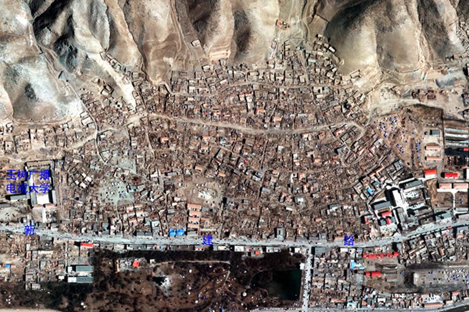 利用對地觀測中心2010年4月16日獲取的高分辨率航空遙感數(shù)據(jù),提取出玉樹州結(jié)古鎮(zhèn)城區(qū)范圍內(nèi)地震破壞最嚴(yán)重或典型地區(qū),使之與GoogleEarth中相應(yīng)位置的震前遙感衛(wèi)星數(shù)據(jù)進(jìn)行對比,直觀展現(xiàn)結(jié)古鎮(zhèn)在此次地震中的受影響程度。圖片來源:中國科學(xué)院