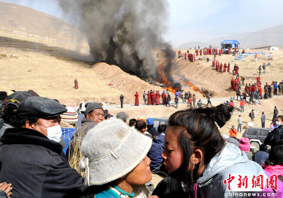 4月17日,青海省玉樹縣結古鎮(zhèn)附近的山坡上,眾多地震遇難者遺體被火葬。當日,為妥善及時處理遇難人員遺體,預防災區(qū)疫情的發(fā)生與流行,青海出臺地震遇難人員遺體處理意見,強調在處理遺體時要尊重少數(shù)民族喪葬習俗,尊重死者尊嚴。中新社發(fā) 廖攀 攝
