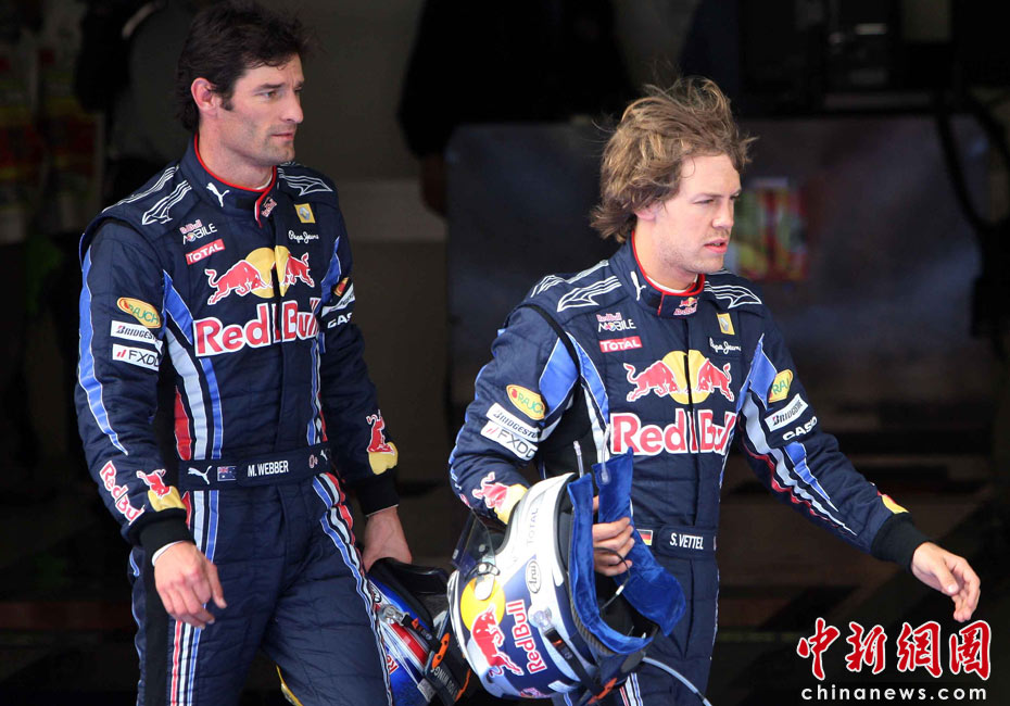 4月17日下午,2010國際汽聯(lián)F1世界錦標(biāo)賽上海站在上海國際賽車場舉行排位賽,代表紅牛車隊出戰(zhàn)的德國車手維特爾(右)獲得桿位,隊友、澳大利亞車手韋伯獲得第二名,法拉利車隊的西班牙車手阿隆索獲得第三名。中新社記者 任晨鳴 攝