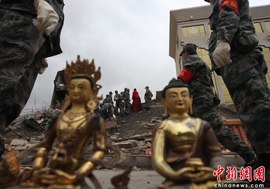 4月17日,青海玉樹結(jié)古鎮(zhèn)民主路,解放軍救援隊為受災民眾從房屋廢墟內(nèi)搜索出多件法器。中新社發(fā) 盛佳鵬 攝