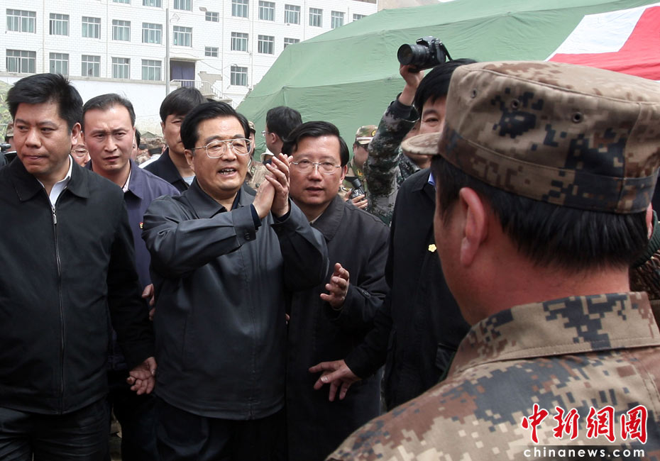 4月18日,中共中央總書記、國家主席、中央軍委主席胡錦濤飛抵玉樹,看望慰問地震災(zāi)區(qū)干部群眾,實(shí)地指導(dǎo)抗震救災(zāi)工作。中新社發(fā) 盛佳鵬 攝