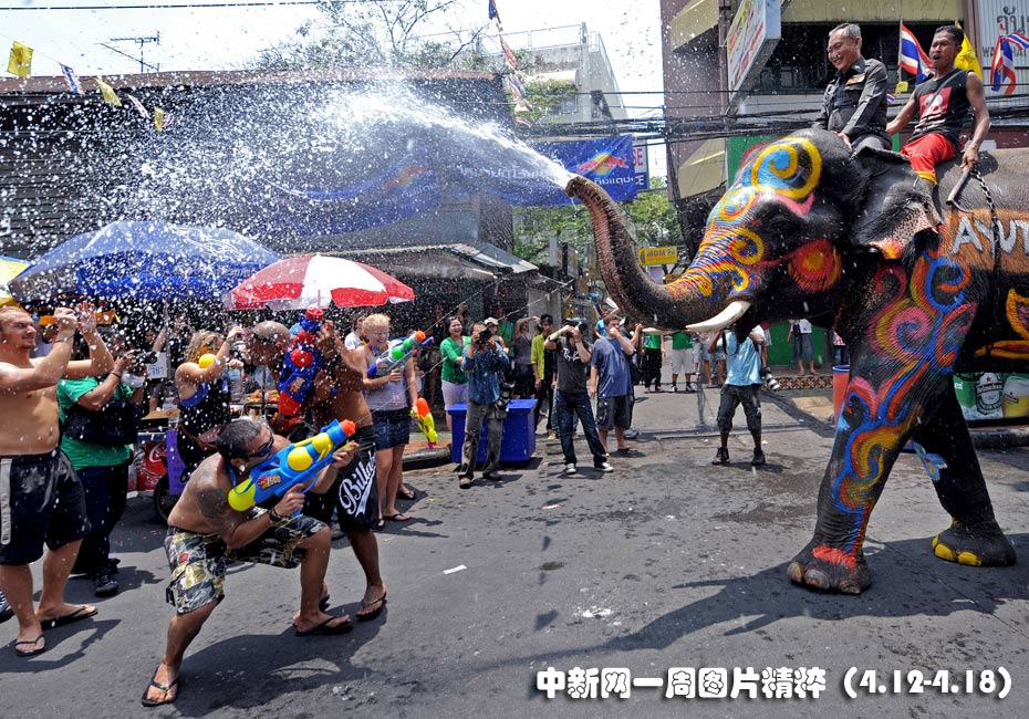 4月12日周一的泰國(guó)曼谷,一只大象在街頭向游人噴水。周二泰國(guó)將迎來(lái)一年一度的潑水節(jié),這是慶祝泰國(guó)新年的節(jié)日。