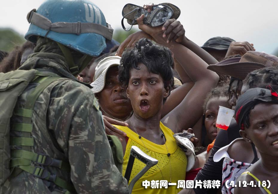 4月12日周一,海底太子港一個(gè)無(wú)家可歸的地震幸存者與前來(lái)分發(fā)食品的巴西聯(lián)合國(guó)維和人員發(fā)生口角。