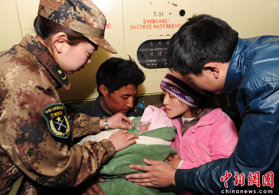4月18日上午9點10分,剛剛到達玉樹機場正在卸下救災物資的廣空運輸航空兵某師劉軍機組,聽說有名早產(chǎn)兒急需轉(zhuǎn)送蘭州軍區(qū)總醫(yī)院救治,僅用15分鐘準備,9點25分飛機提前起飛。懷孕8個多月藏族婦女尼瑪拉毛,由于地震驚嚇導致早產(chǎn)。當日凌晨4點轉(zhuǎn)院途中,在蘭州軍區(qū)323醫(yī)院婦產(chǎn)醫(yī)生王小特、盧小娟的幫助下,產(chǎn)下一男嬰。由于早產(chǎn)、產(chǎn)程長,嬰兒嚴重缺氧,發(fā)生紫疳,為了盡快挽救嬰兒生命,準備轉(zhuǎn)往蘭州軍區(qū)總醫(yī)院。圖為蘭州軍區(qū)323醫(yī)院救護隊員隨機救護。中新社發(fā) 沈玲 攝