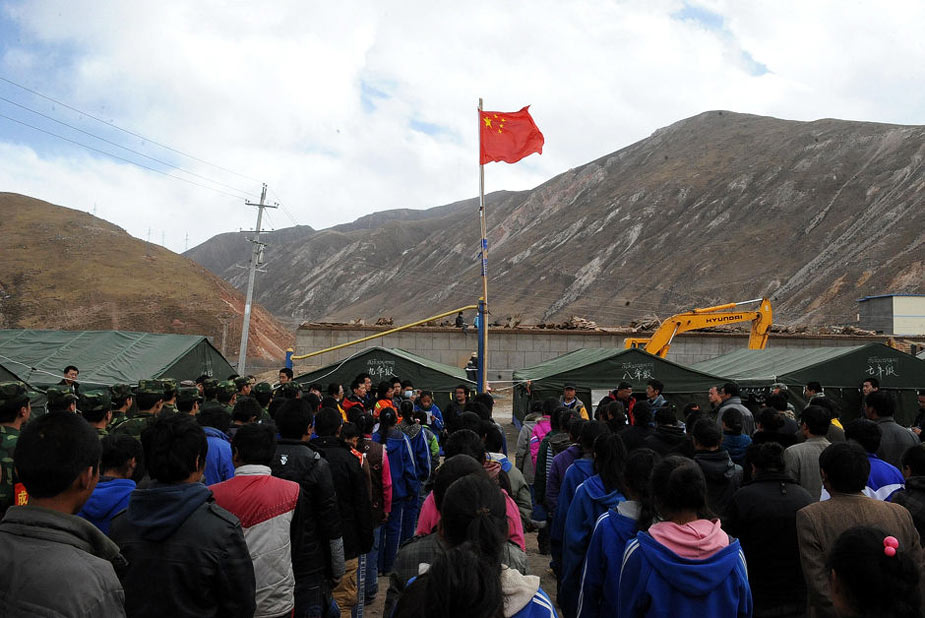 4月18日,70多名孩子在地震四天后重新走進了課堂,玉樹州孤兒學校成為了地震災區(qū)第一所復課的學校,剛完成帳篷搭建的青海省玉樹藏族自治州第一民族中學3個年級的學生也開始復課。圖為4月18日,青海省玉樹藏族自治州第一民族中學師生舉行復課儀式。圖片來源:新華網(wǎng)