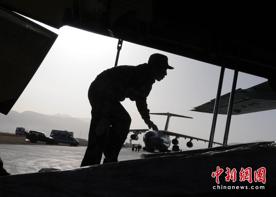中國(guó)士兵正在空軍伊爾76重型運(yùn)輸機(jī)上搬下救災(zāi)帳篷,4月中旬以來(lái)他們連日在青海玉樹(shù)機(jī)場(chǎng)進(jìn)行抗震救災(zāi)工作。中新社發(fā) 賈國(guó)榮 攝