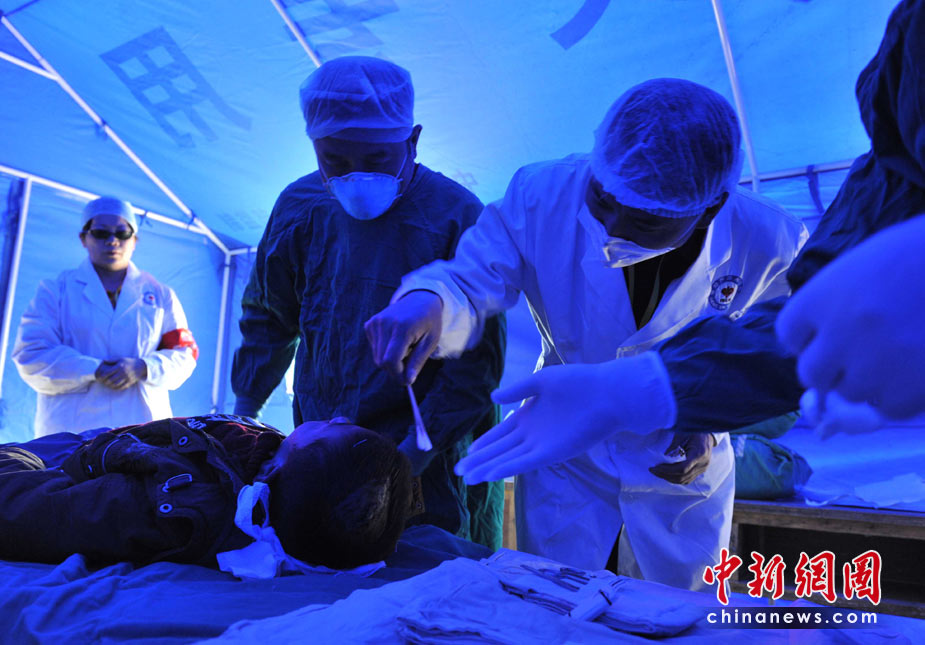 四川省綿陽市中心醫(yī)院院長王東率領(lǐng)的醫(yī)療救護(hù)隊(duì),正在為一名身上遭受多處地震創(chuàng)傷的玉樹藏族男孩換藥。他們借助汶川大地震的救護(hù)經(jīng)驗(yàn),援助青海玉樹縣醫(yī)院展開4月中旬的抗震救災(zāi)。中新社發(fā) 賈國榮 攝