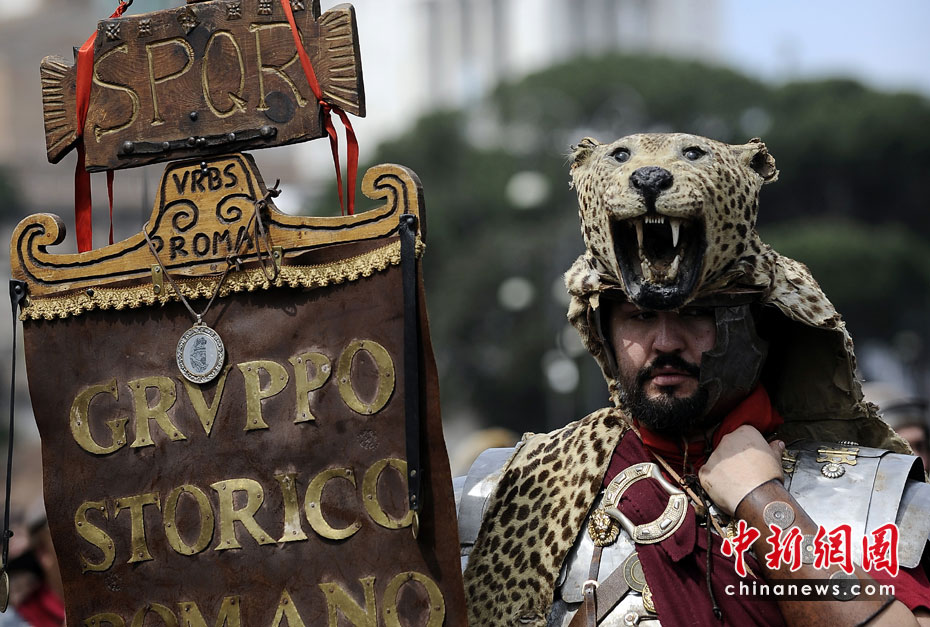 4月18日,意大利羅馬,男子打扮成武士在圓形競(jìng)技場(chǎng)附近參加游行,慶祝羅馬建城2763周年。圖片來(lái)源:中國(guó)新聞網(wǎng)